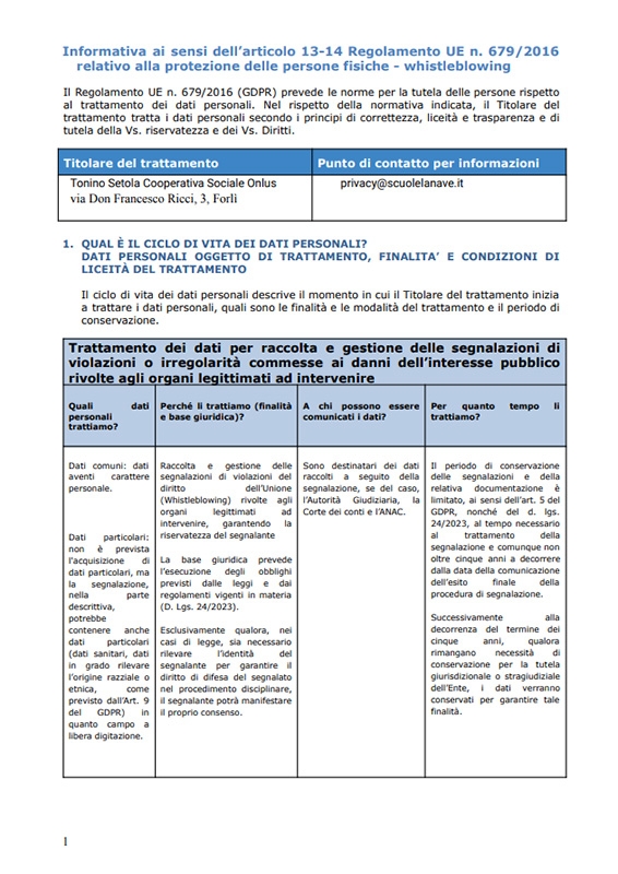 La Tonino Setola Coop. Soc. Onlus ha adottato un “Regolamento per la gestione delle segnalazioni di illeciti (whistleblowing) e tutela del segnalante (whistleblower) ai sensi del D.lgs. 10 marzo 2023, n. 24”, in cui sono disciplinati i termini e le competenze per la gestione delle segnalazioni stesse.