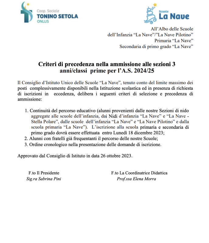 CRITERI DI PRECEDENZA NELL'AMMISSIONE DELLE CLASSI PRIME 2024-25