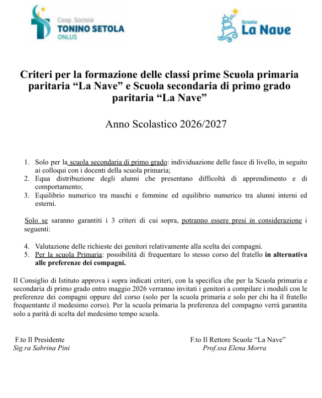 CRITERI PER LA FORMAZIONE DELLE CLASSI PRIME SCUOLA PRIMARIA E SECONDARIA A.S. 2026-2027