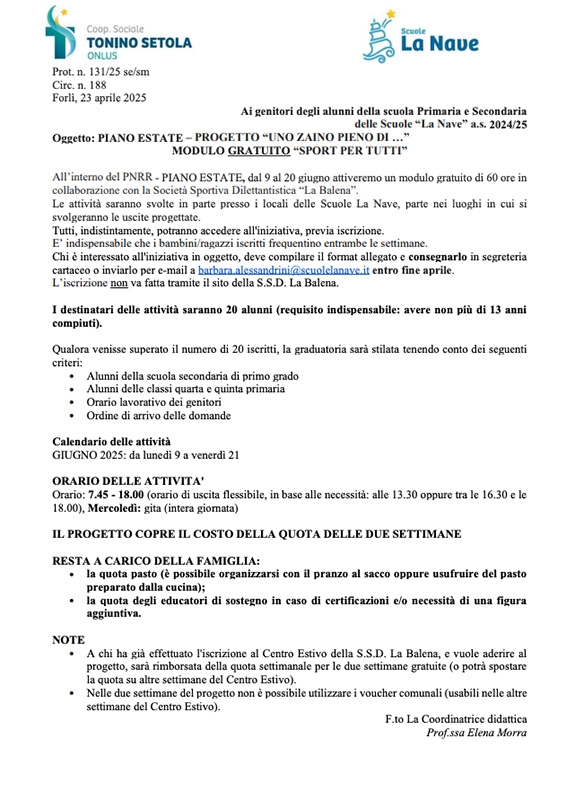 Circ. n. 188 se_sm Lettera alle famiglie per PIANO ESTATE SPORT PER TUTTI
