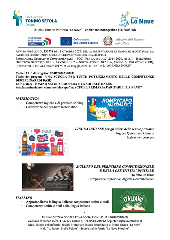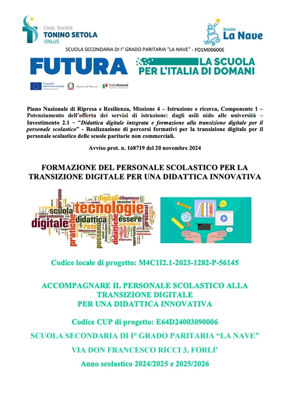 La scuola presenta diversi progetti nell'ambito del PN, del PNRR e dei bandi proposti da fondazioni ed enti, sia pubblici che privati.